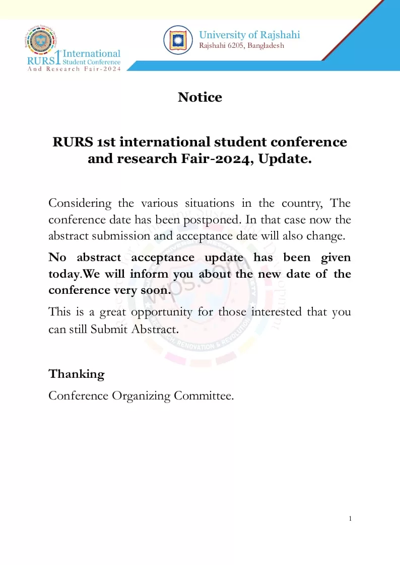 The objective of RURS 1st ISCRF 2024 is to present the latest research and results of researcher and research enthusiasts (Preferred undergraduate students, post graduate students and post-doc researchers) related to their interested fields. The main aim of the conference is to motivate students in scientific work as well as to build a research culture among University students.